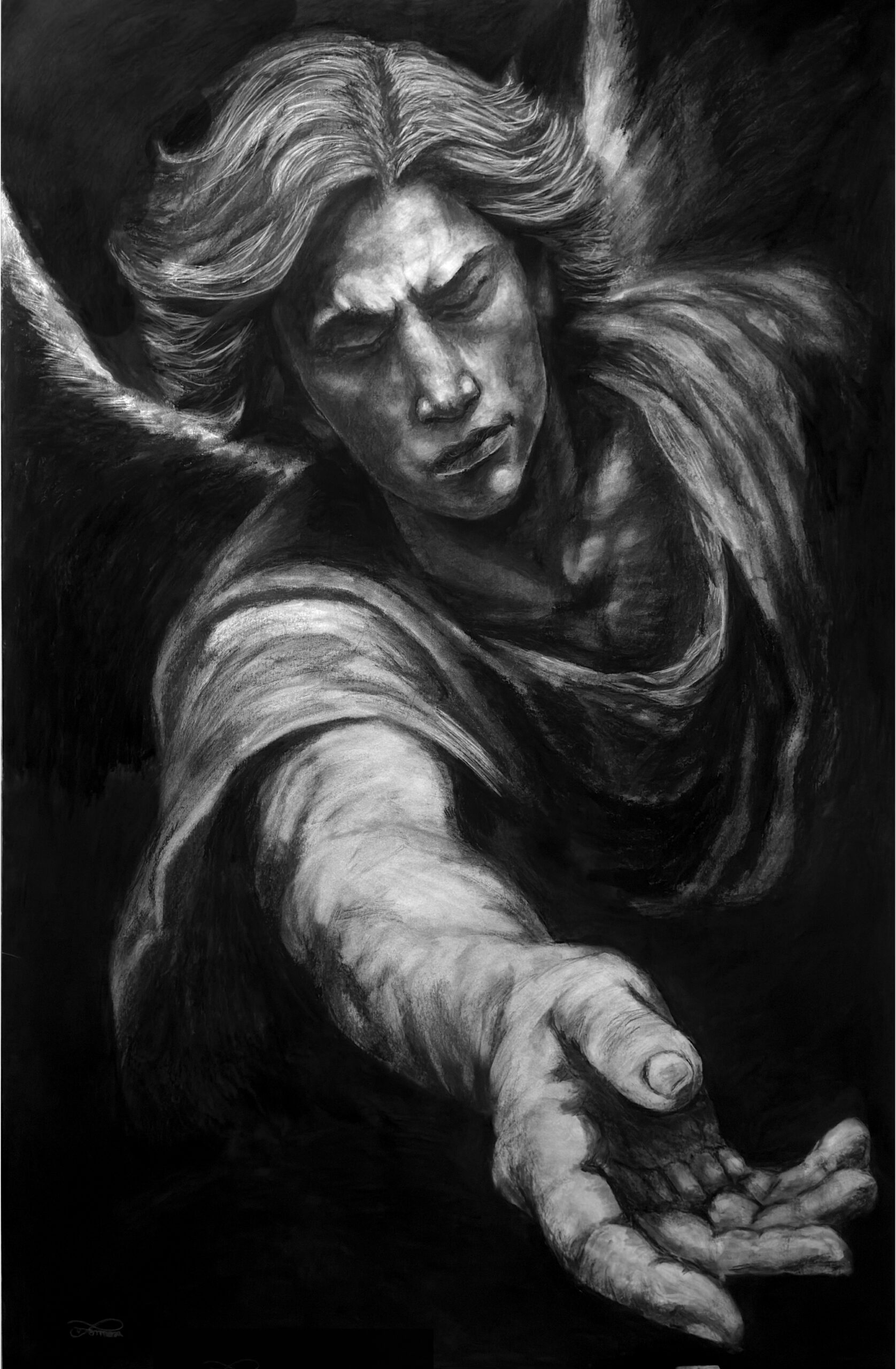 This piece aims to capture the duality of life, man and the heavens. The composition is a perspective drawing. If seen from from below, the angel can be seen as a saviour, stretching out his hand to guide and help you. If seen from above, the angel can be seen as a fallen seraph, raising his hand in a cry for help. The name is a word play capturing Faith’s descent to help humanity or Faith’s literal descent of fallen angels