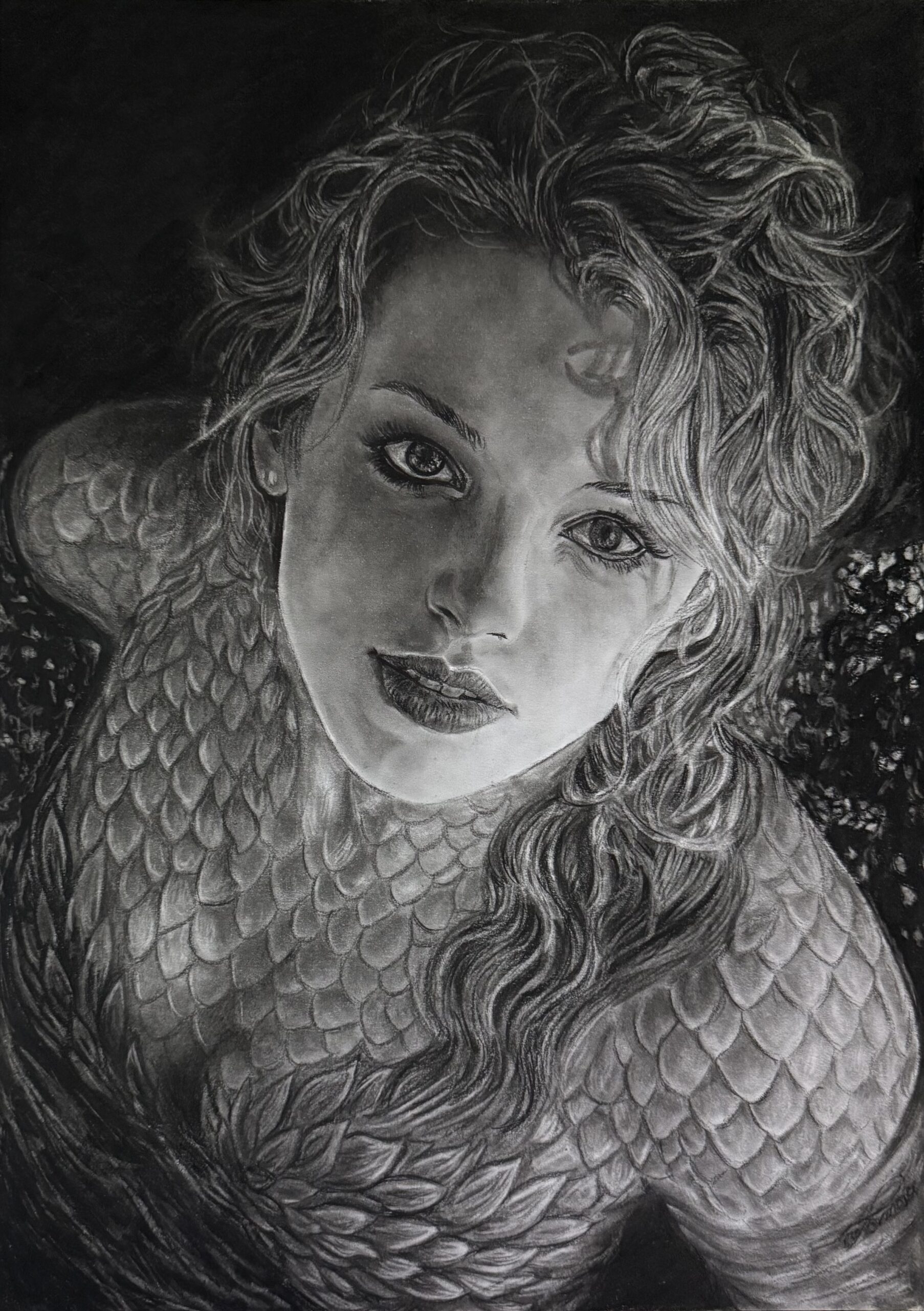 The siren was once known for luring sailors to their deaths through song. Yet the piece captures not a moment of deception, but a moment of curiosity.